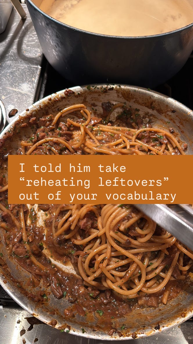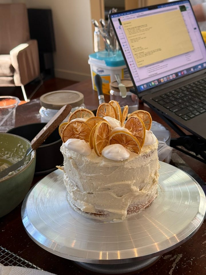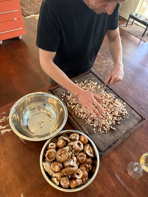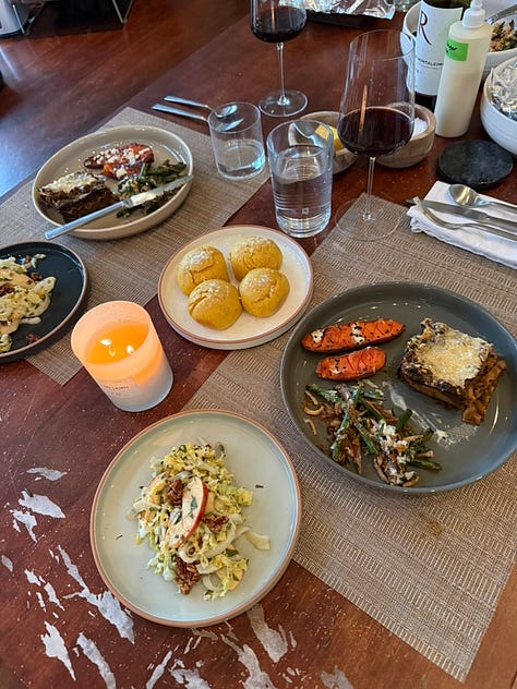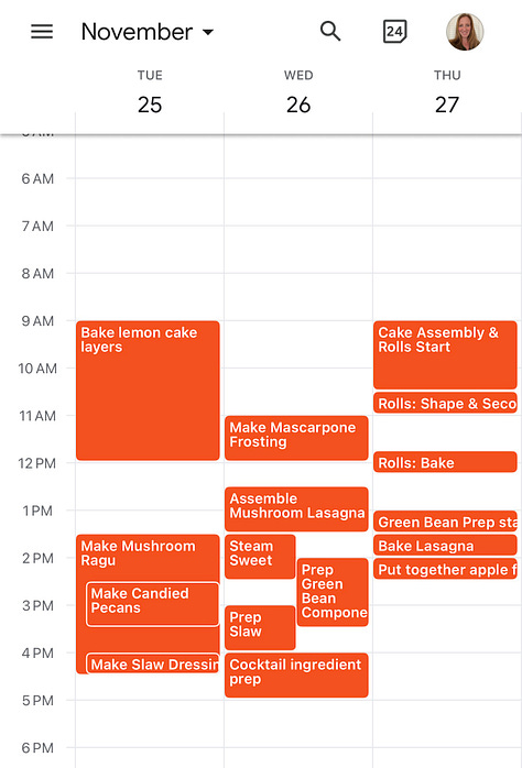 Claude helped me break it into a four-day prep schedule. What to make Monday (vegetable broth, mostly hands-off simmering). What to bake Tuesday (cake layers, mushroom ragù). What to assemble Wednesday. What to save for Thursday morning so the rolls would be fresh.